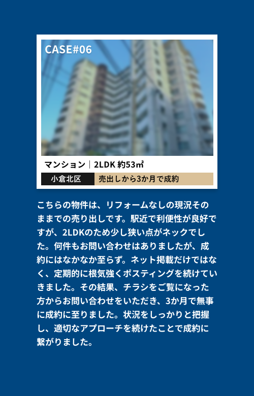 ネット掲載で物件をお探しのお客様に届き、チラシ広告で潜在顧客へアプローチ。紹介や口コミにもつながるハイブリッド販売で早期売却を促します。